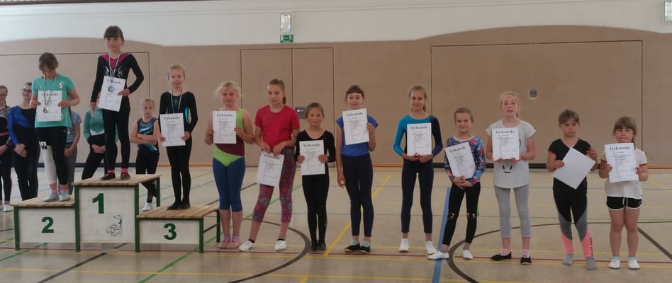 Am 18. Mai führten wir bereits zum 2. mal einen Wettkampf durch, bei dem alle Mädchen aus Ute´s Trainingsgruppen die Möglichkeit bekamen ihren Eltern einmal zu zeigen, was sie im Training bisher gelernt haben. Insgesamt 21 Turnerinnen trauten sich, ihre Übungen vor dem Publikum, bestehend aus Eltern und Familie, zu zeigen. Förmlich greifbar war die Nervosität bei einigen Mädchen vor dem Wettkampf. Dennoch gaben alle ihr Bestes und turnten schöne Übungen an den Geräten Sprung, Stufenbarren, Balken und Boden. Die gezeigten Übungen wurden von den Zuschauern mit viel Beifall bedacht und ließen die Nervosität alsbald vergessen. Mit Mathilda (Leistungsklasse 1) und Marie (Leistungsklasse 2) wurden nach dem Wettkampf zwei strahlende Siegerinnen geehrt. Aber auch alle anderen Mädchen können stolz auf ihre Leistungen sein! Herzlichen Glückwunsch allen Teilnehmerinnen!